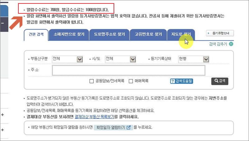 참고로 등기부등본을 확인하는 데에는 열람 수수료 700원이 발생해요. 발급 수수료는 1000원이고요. 300원 더 내고 발급을 받는 것이 더 나을 것 같아요. 무료로 등기부등본의 일부를 확인하는 방법도 있는데요. 같이 설명 드릴게요. 일단 결제는 마지막에 하는 것이기 때문에 등기부등복 확인이 필요한 토지나 건물의 위치를 검색해 주세요.
