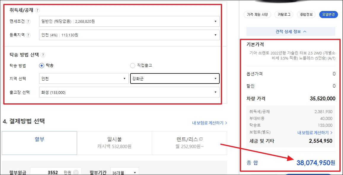 마지막으로 자동차 구매시 발생하게 되는 취득세, 공채, 탁송료에 대한 정보를 입력합니다. 이렇게 4가지 과정을 거치면 홈페이지 우측에 있는 가격표를 통해 최종 금액 확인이 가능합니다. 이런 식으로 기아 자동차 차종별 판매 금액을 확인하면 됩니다.