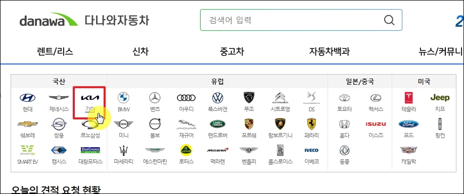 홈페이지에 접속하면 국산, 유럽, 일본, 중국, 미국 브랜드가 보일 겁니다. 여기에서 기아 자동차를 선택합니다. 지금부터 잘 따라하시면 되는데요. 참고로 현대, 쌍용, 쉐보레, 르노삼성 등 여러 자동차 브랜드의 차종별 가격표 확인도 여기서 할 수 있습니다.