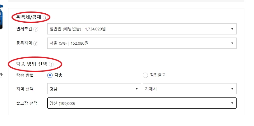 ▼마지막으로 탁송할 때 발생하는 비용과 취득세 및 공채비용에 관한 것입니다. 지역이나 조건을 선택하면 됩니다.