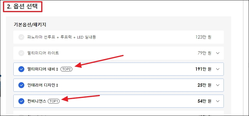 ▼이번에는 옵션을 선택합니다. 사람마다 선호하는 투싼 옵션이 다릅니다. 각 옵션에 대한 가격표 확인도 할 수 있으니 인기 표시와 함께 감안하여 선택하시길 바랍니다.