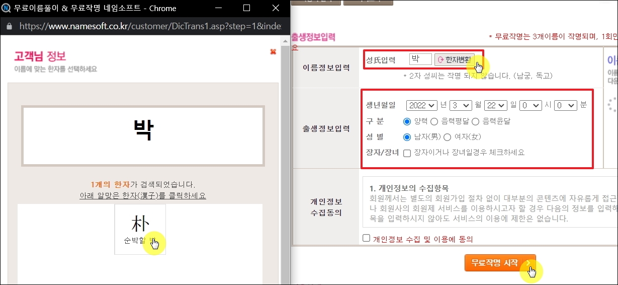 ▼메뉴에서 [무료 선호 이름 작명]을 클릭합니다. 그다음 출생정보를 입력해야 합니다. 성 씨와 생년월일, 성별, 장자 또는 장녀 여부를 순차적으로 입력하고, [무료작명 시작] 버튼을 클릭합니다.