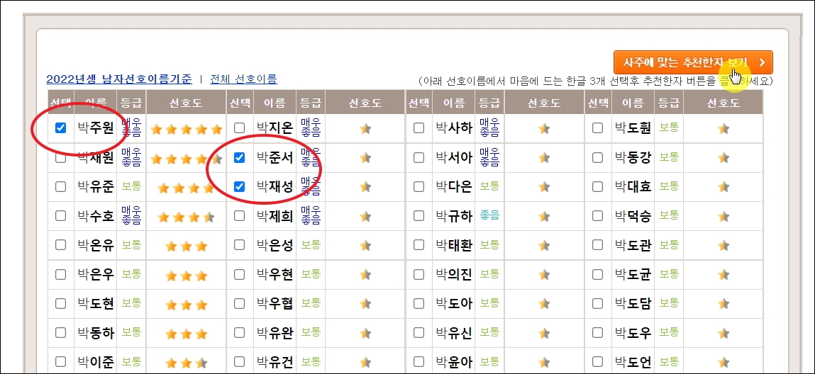 ▼표를 보면 알겠지만, 각 이름에 대해 등급과 선호도 표시가 되어 있습니다. 이를 참고하여 마음에 드는 것을 선택하면 됩니다. 3가지를 선택한 후 표에서 우측 상단에 있는 [사주에 맞는 추천한자 보기] 버튼을 클릭합니다.