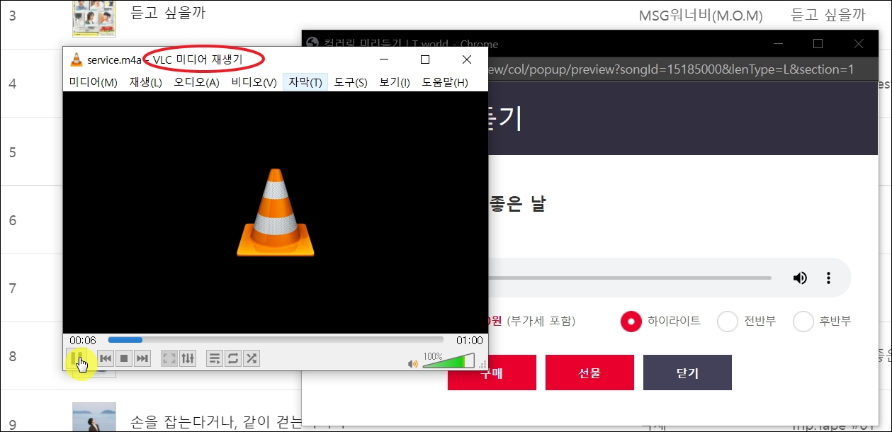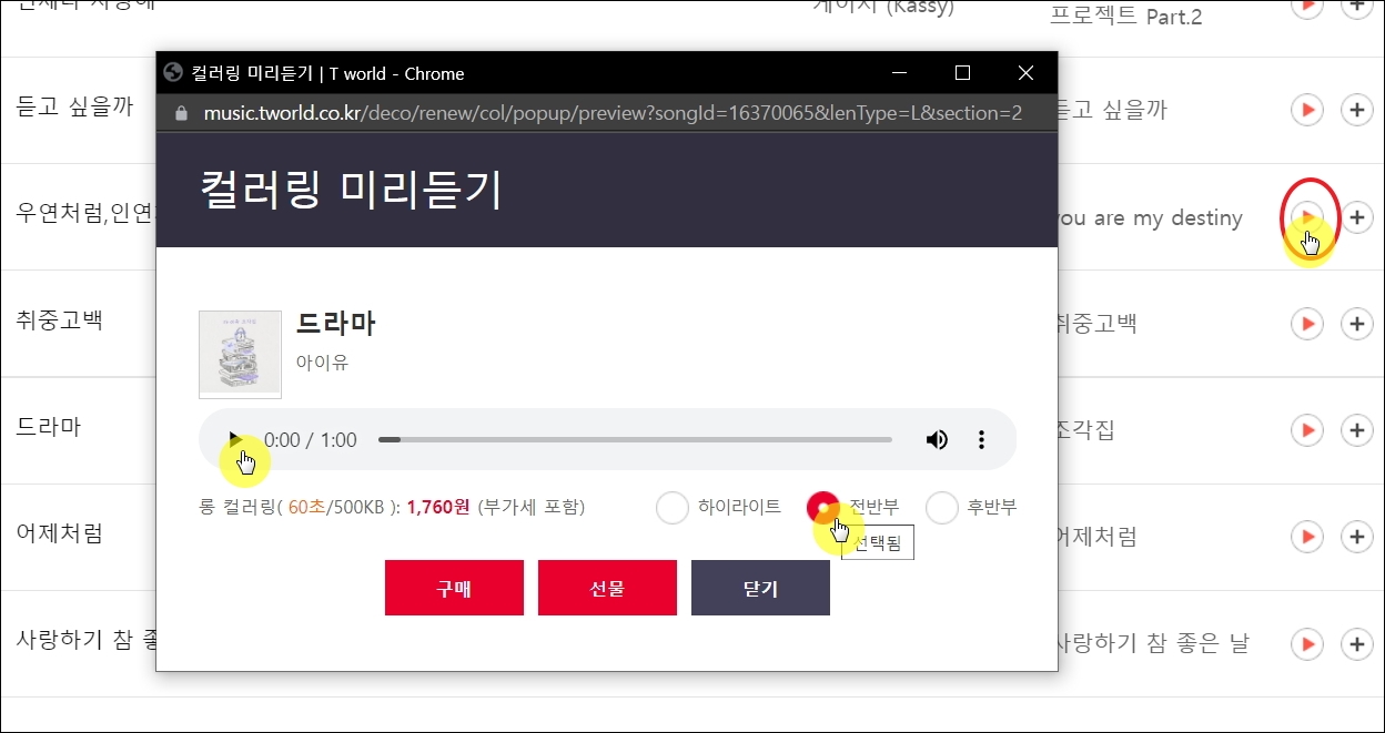 ▼컬러링을 적용하기에 앞서 [듣기] 버튼을 클릭합니다. 그럼 해당 음원을 미리 듣는 것이 가능합니다. 한 음원에 대하여 하이라이트, 전반부, 후반부 이렇게 3가지 버전이 마련되어 있습니다. 1분 정도 길이의 음원을 들어볼 수도 있습니다. 재생 버튼을 누르면 꽤 좋은 음질로 해당 컬러링 음원을 들어볼 수 있습니다.