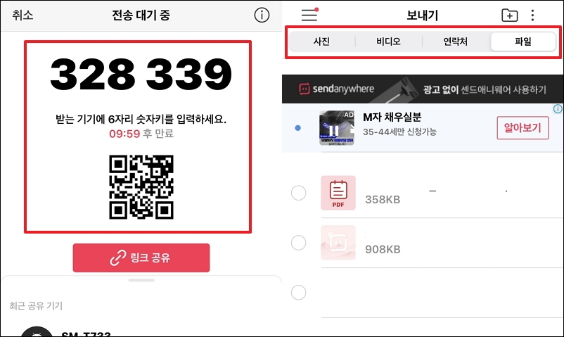▼새롭게 창이 열리면서 6자리 숫자키와 QR코드를 얻게 됩니다. 10분 뒤에 만료가 되기 때문에 10분 안에 컴퓨터로 받기 과정을 진행하면 됩니다. 사이트에 접속해서 코드 입력하고, 받기 버튼을 누르면 될 정도로 매우 쉽습니다. 참고로 send anywhere 앱에서 상단에 있는 메뉴를 보면 사진 외에도 비디오, 연락처, 파일을 옮기는 것이 가능합니다.