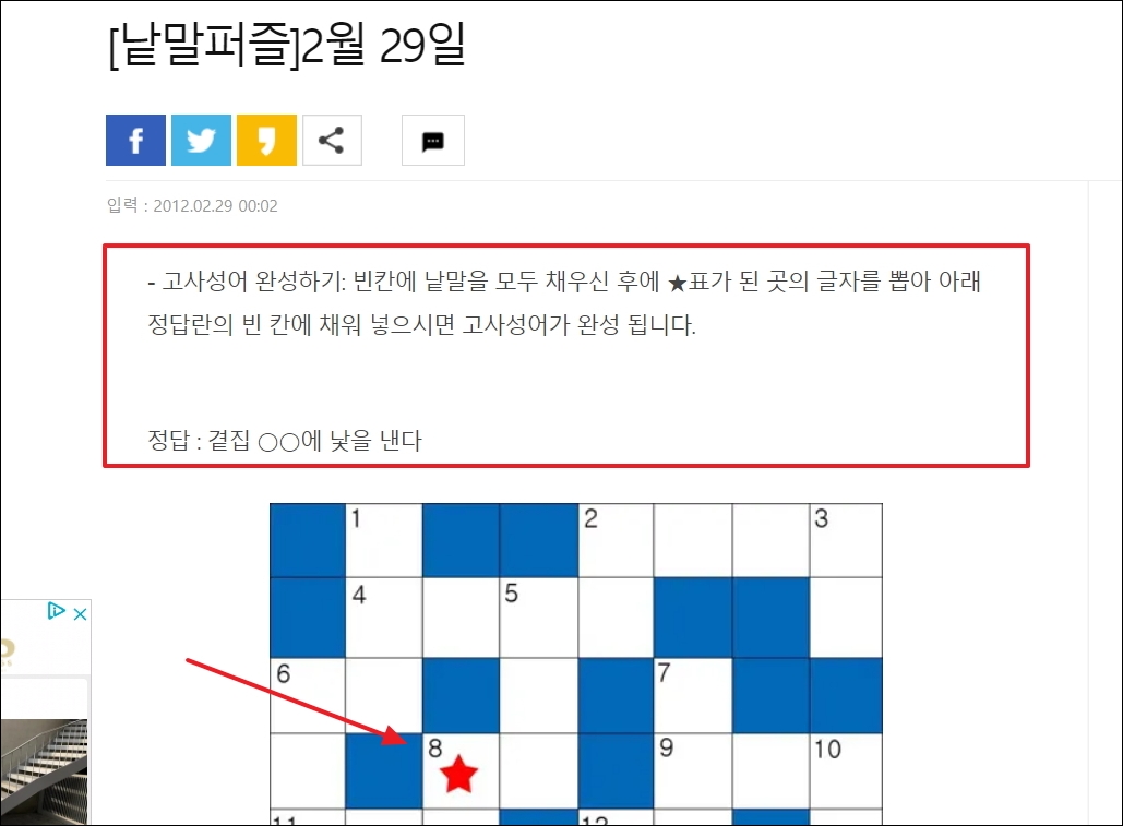 ▼퍼즐 게시물을 선택하면 바로 가로세로 낱말 퍼즐을 만나볼 수 있습니다. 여기에서는 빈 칸에 들어가는 답을 맞추는 것과 함께 별표에 있는 문자 맞추기를 요구합니다. 해당 문자를 가지고 정답란의 빈 칸에 채워 넣어 고사성어를 완성 시키면 돼죠.