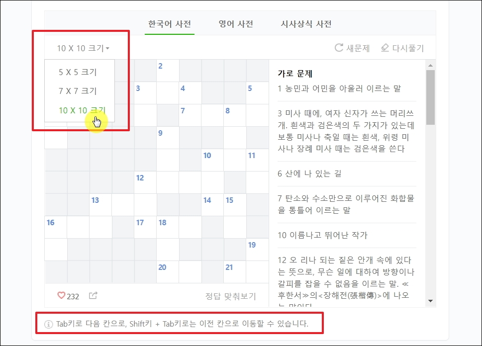 ▼네이버 가로세로 낱말맞추기 게임의 경우 3가지 크기와 3가지 사전을 사용합니다. 처음에는 5x5 사이즈를 이용하다가 실력이 늘면 10x10 사이즈로 변경하면 됩니다. 빈 칸을 마우스로 선택한 후 답을 입력하면 됩니다. 키보드로 커서 이동을 하고 싶다면 Tab키와 Shift + Tab키를 사용하면 됩니다. 그럼 다음 칸 또는 이전 칸으로 커서가 이동합니다.