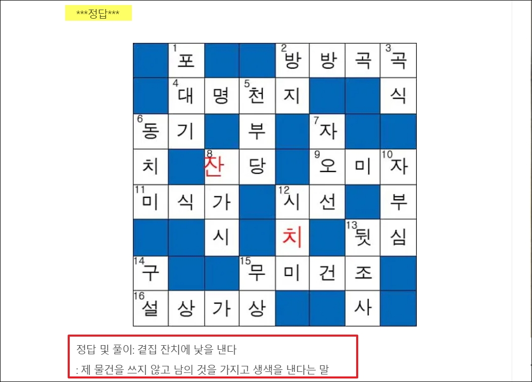 ▼낱말 퍼즐 페이지에서 화면을 쭉 내려보면 가로세로 빈 칸에 정답이 표시되어 있는 정답표를 찾을 수 있습니다. 고사성어에 대한 풀이도 있으니 함께 보시길 바랍니다.