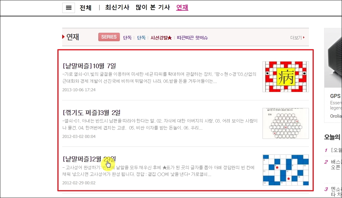 ▼스포츠경향 사이트에서 연재 중인 퍼즐 기사가 날짜별로 나타났습니다. 과거에 연재된 것들이기 때문에 시간이 많이 지났지만, 낱말맞추기를 하는 데에는 전혀 지장이 없습니다. 새로운 단어가 엄청나게 생긴 것도 아니기 때문이죠.