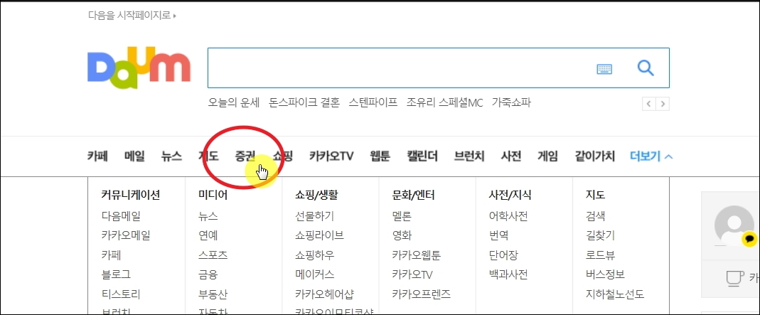 ▼다음의 증권 사이트에 접속했습니다. 가장 먼저 확인해야 할 것이 있습니다. 바로 오늘의 증시에 있는 국내 및 미국 지수입니다. 실시간으로 그려지는 그래프를 통해 증시 분위기를 쉽게 파악할 수 있도록 되어 있습니다. 사이트 화면 우측에 보면 [전종목 시세 보기] 버튼일 있습니다. 클릭해 보겠습니다.