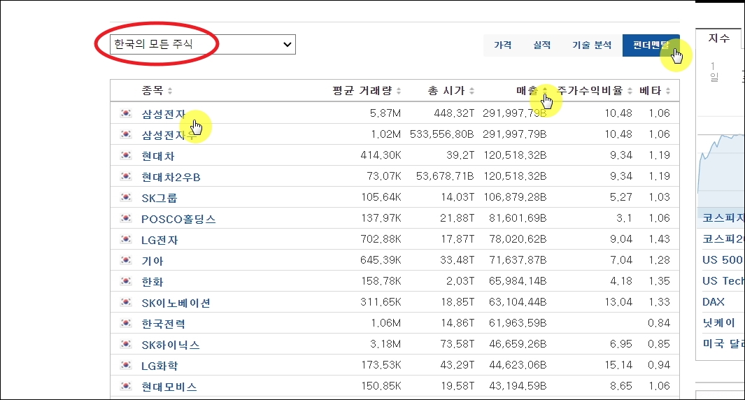 ▼한국 주식에 관련된 페이지가 나타났습니다. 좌측 상단에 보면 셀렉트 박스가 있습니다. 여기를 보면 코스피 50, 코스닥 등 여러 기준에 포함된 주식 전종목을 선택할 수 있도록 되어 있습니다. 여기에서 [한국의 모든 주식]을 선택하면 실시간으로 주식 전종목 시세를 표로 살펴볼 수 있습니다.