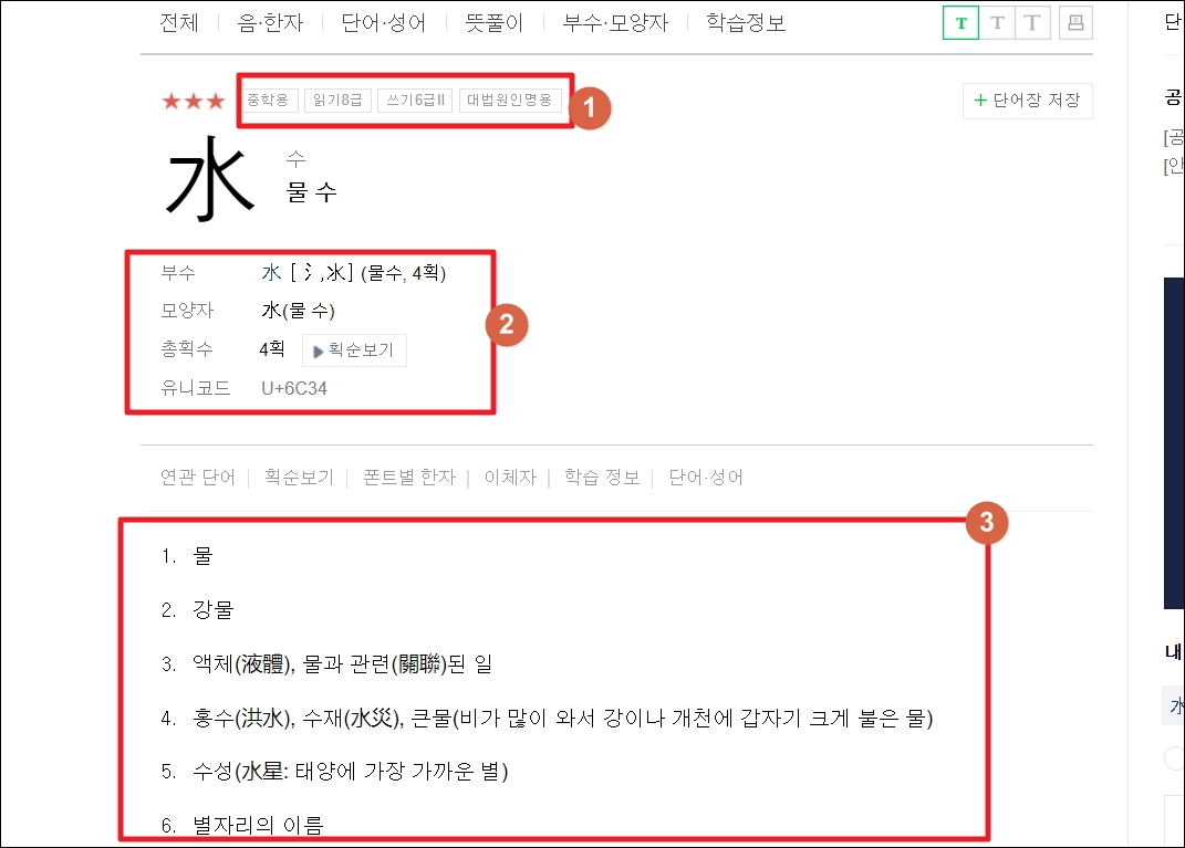 ▼저는 "물 수"를 선택했습니다. 이에 따라 이와 관련된 정보를 볼 수 있습니다. 이곳을 통해 부수, 모양자, 총 획수, 유니코드, 난이도, 인명용 여부 등 여러 가지 사전 정보를 얻을 수 있습니다. 뜻의 경우에는 책으로 된 옥편보다 훨씬 많은 뜻을 만나볼 수 있습니다.