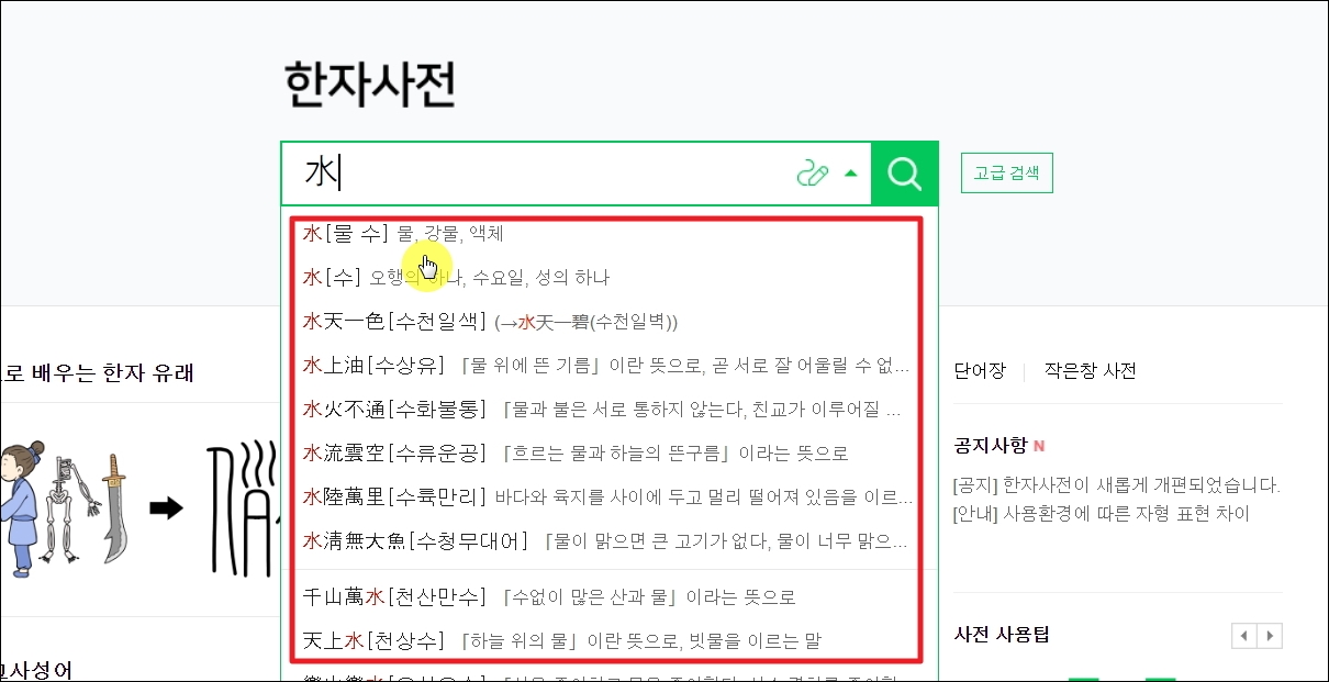 ▼메뉴에서 [한자]를 선택하면 한문사전 전용 페이지가 열립니다. 검색창 옆에 보면 필기 아이콘과 [고급 검색] 버튼이 있습니다. 해당 버튼을 통해 문자 모양을 그리거나 부수, 음, 모양자, 음, 총 획수로 모르는 한자를 찾아 보는 것이 가능합니다.