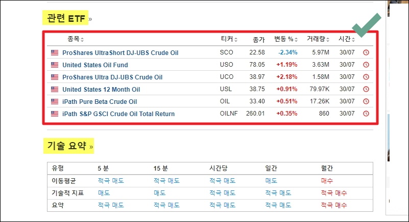 ▼전문적으로 투자하는 분이 아니라면 국제유가 선물 상품에 바로 투자하는 것은 매우 위험합니다. 레버리지가 크기 때문이죠. 초보자인 경우에 국제유가에 관하여 투자를 하고 싶다면 ETF를 이용하는 것이 좋습니다. 매우 적은 금액으로 투자가 가능하고, 변동도 최소화할 수 있습니다. 미국 주식시장에서 거래되는 관련 ETF를 표로 볼 수 있는데요. 미국 증시가 열린 상태에서 해당 ETF에 대한 시세도 실시간으로 반영되는 것을 볼 수 있습니다.