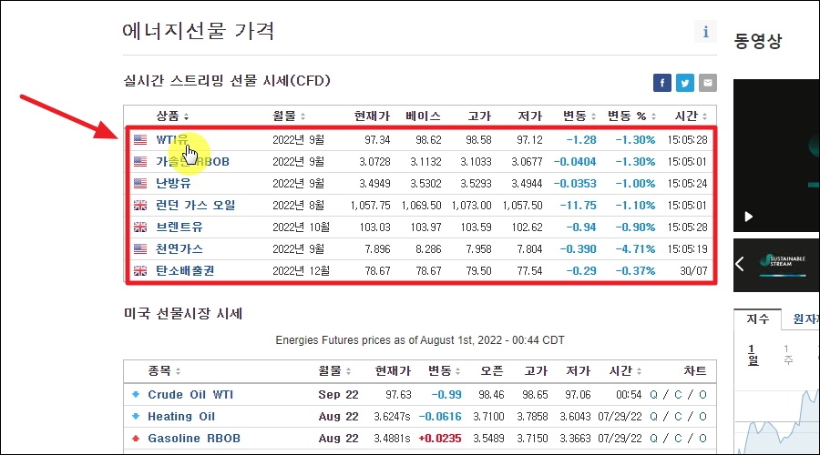 ▼에너지 선물 가격 페이지가 열렸습니다. 실시간으로 국제유가 선물 시세를 확인할 수 있는 표가 보이는데요. 현재 거래가 되는 중이기 때문에 표에 있는 시세(현재가)가 실시간으로 변하는 것을 확인할 수 있습니다. 보통 WTI유와 브랜드유를 많이 보고, 여기에 관련된 선물이나 ETF에 투자를 하는 경우가 많은데요.