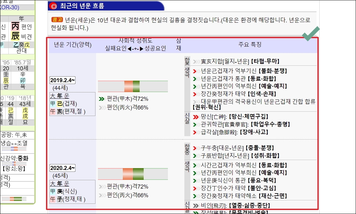 ▼대운 다음에는 연운의 흐름입니다. 나의 삶에 직접적으로 영향을 주는 운에 관련이 있다고 하는데요. 이를 통해 성취, 화합, 분쟁, 풍요 등 여러 일들을 예견할 수 있습니다.
