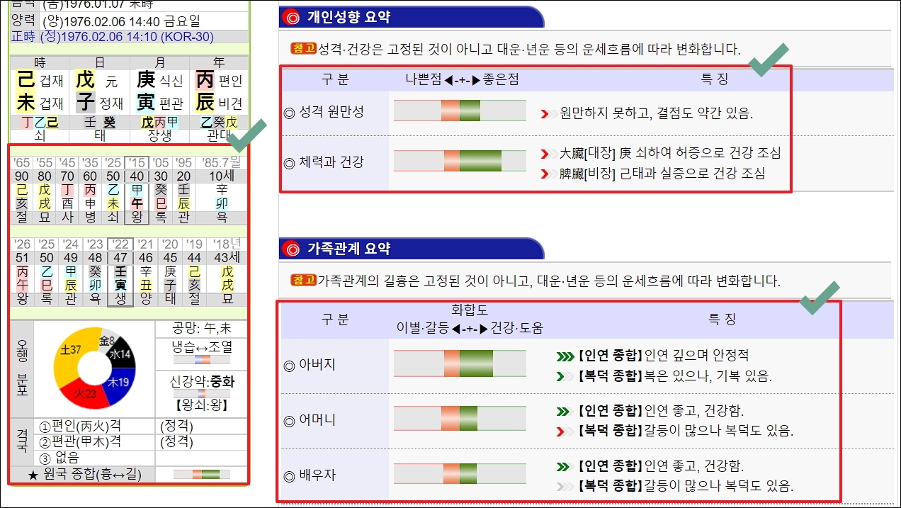 ▼새롭게 열린 페이지를 보면 좌측에는 대운, 연운, 오행, 격국에 관한 내용이 있습니다. 이것만 보고는 나의 만세력 결과가 어떠한지 파악이 안되죠. 그래서 바로 오른편에 좀 더 상세한 풀이가 나와 있습니다. 성격 원만성, 체력, 건강, 가족관계에 관련된 풀이를 읽어볼 수 있어요.