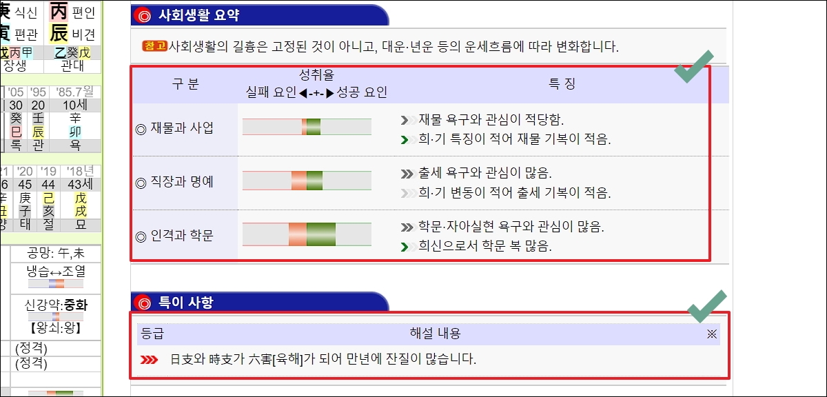 ▼이번에는 사회생활에 속하는 재물과 사업, 인격과 학문, 직장과 명예에 대한 내용이 나왔습니다. 만세력을 통해 출세, 학문, 재물에 대한 것을 알아볼 수 있어요. 특이사항의 경우에는 나오는 사람도 있고, 그렇지 않은 사람도 있습니다.