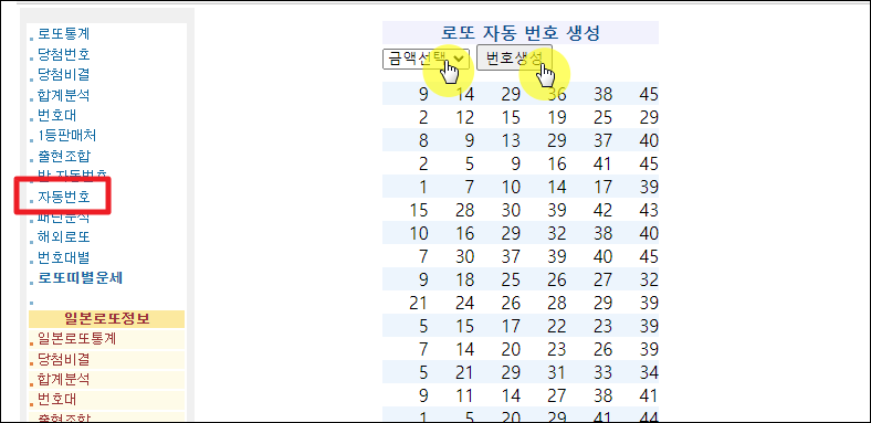 ▼통계 분석을 기반으로 한 것이 아니고, 그냥 여러 개의 로또 예상번호를 받아보고 싶을 수 있습니다. 이러한 경우에는 [자동 번호] 메뉴를 클릭해 보세요. 그럼 다음과 같은 화면이 나타나는데요. 로또 복권을 구매할 금액을 선택한 후 [번호 생성] 버튼을 누르면 해당 액수에 맞게 예상번호 리스트를 받아볼 수 있습니다.