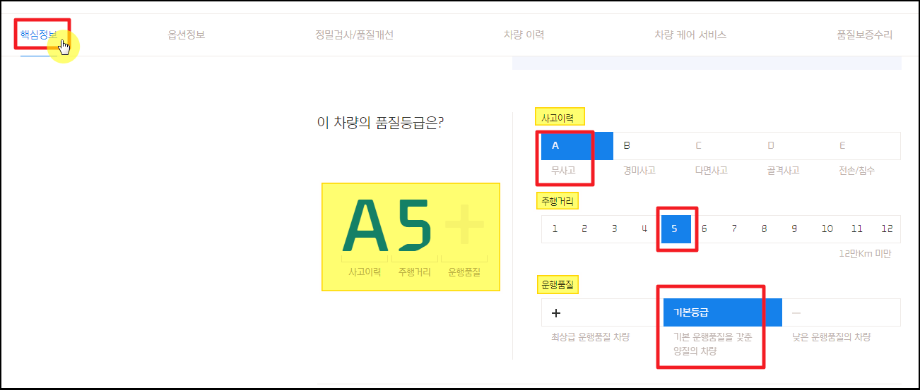 ▲ 사진 다음으로는 선택한 경차에 대한 여러 가지 스펙을 확인할 수 있는데요. 가장 먼저 중고차의 품질 등급입니다. 사고이력, 주행거리, 운행품질을 기준으로 점수를 메긴 것이죠.