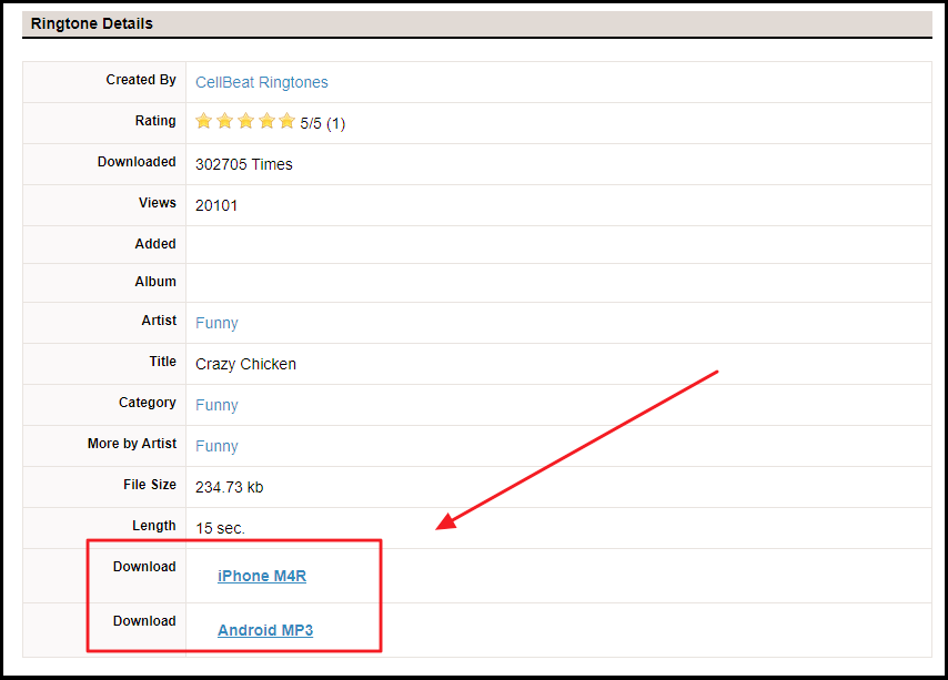 ▼ 그 다음에는 상세 스펙표가 나타나는데요. 여기에서 Download 항목을 보면 아이폰과 안드로이드폰 전용으로 만들어진 무료 벨소리 다운받기 가능하도록 버튼이 마련되어 있습니다.