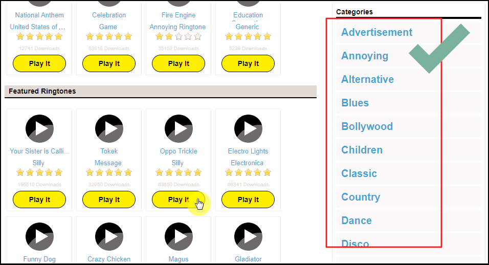 ▼ Cellbeat 홈페이지에 접속했어요. 메인화면을 보면 여러 가지 무료 벨소리 리스트가 많이 나오는데요. "Play It" 버튼을 누르면 바로 감상도 할 수 있어요. 사이트에서 오른편에 보면 여러 가지 메뉴가 나타나는데요. 원하는 장르를 선택하거나 인기 있는 곡과 같은 특별한 벨소리 음원 리스트를 살펴보는 데에 도움이 됩니다.