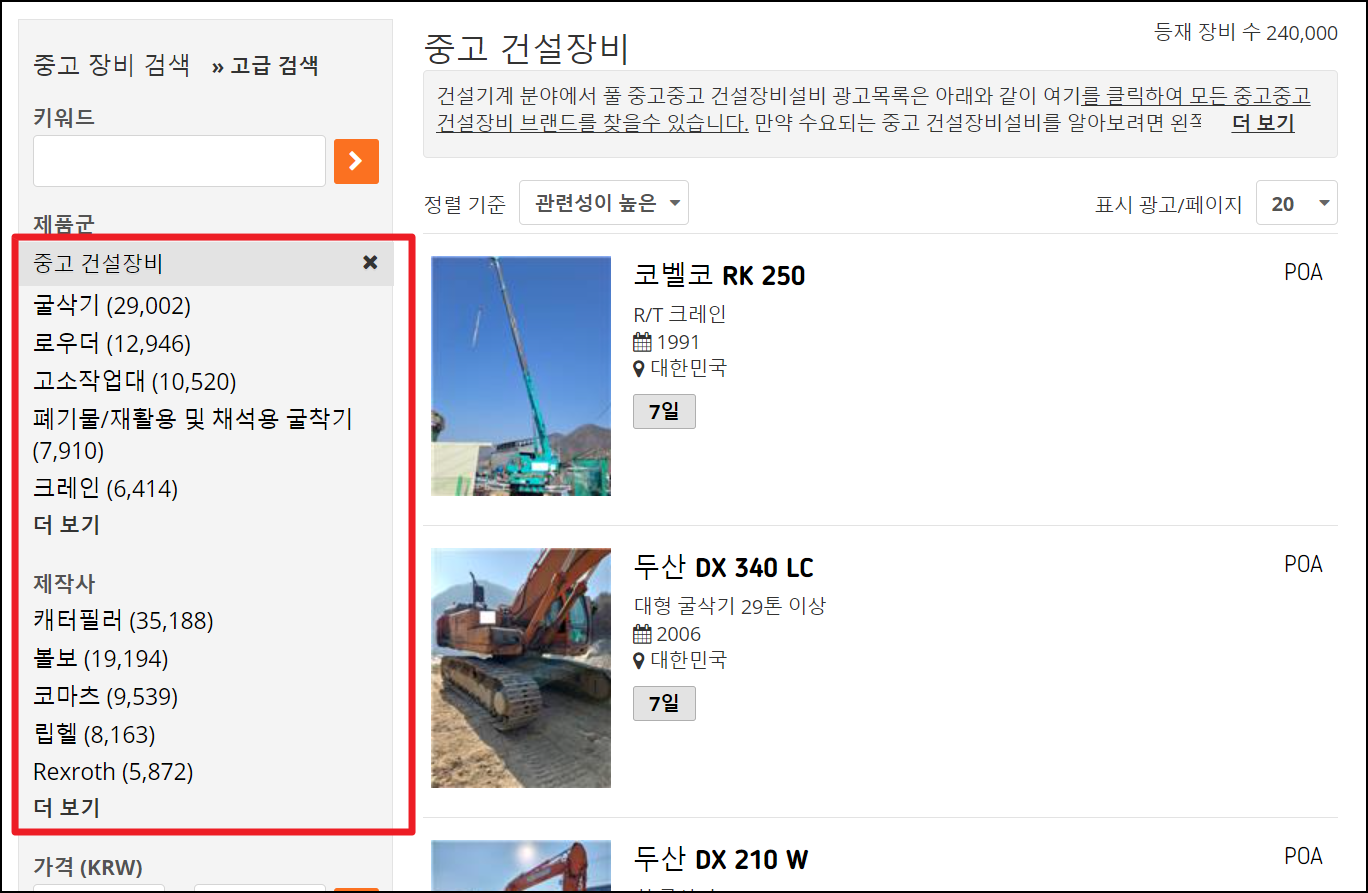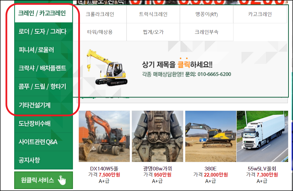 이곳에서 거래할 수 있는 중장비의 종류는 꽤 다양한데요. 크게 크레인, 로더, 도자, 그레다, 피리셔, 로울러, 크락샤, 배차플랜트, 콤푸, 드릴, 항타기, 기타 건설기계 등 많은 기기를 다루고 있습니다. 세부적으로도 분류가 잘 되어 있기 때문에 알아보길 원하는 중장비에 대한 정보에 손쉽게 접근이 가능합니다.