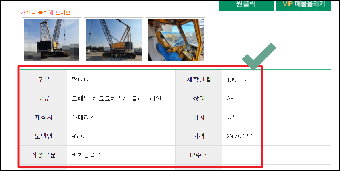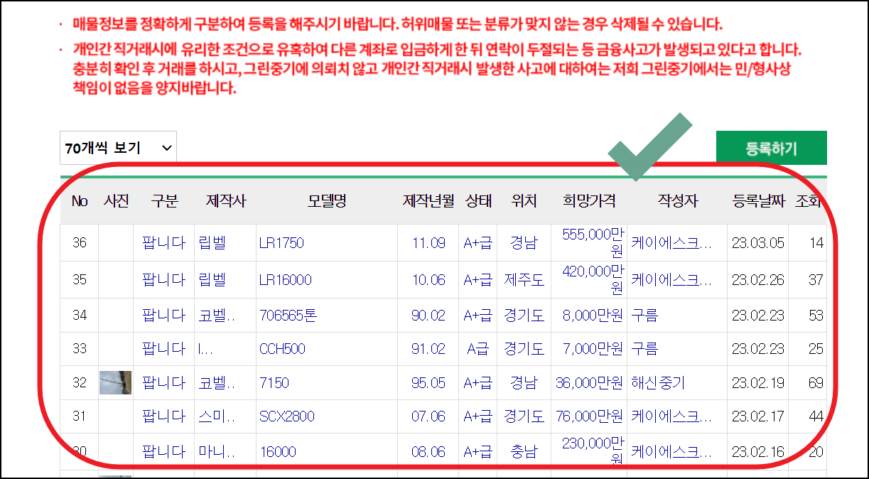 각 매물에 대해서는 사진, 제작사, 모델명, 제작년월, 상태, 위치, 희망가격 등 매매정보가 잘 표시되어 있는데요. 이러한 부분을 참고하여 중장비 거래를 하는 데에 활용하시면 됩니다.