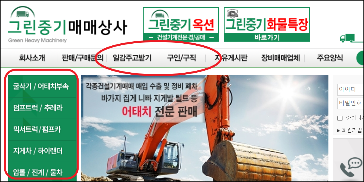 첫 번째로 소개해 드리고 싶은 곳은 그린중기 매매상사 사이트입니다. 서울, 경기권에 위치하고 있어 수도권에 계시는 분들의 경우에는 접근성이 좋아요. 사이트 방문 횟수를 보면 아시겠지만, 중장비에 관심 있는 사람들이 많이 이용하는 곳입니다. 매매정보는 기본이고, 구인구직이나 일감주고받기 등 이쪽 업계에 종사하시는 분들에게 여러 모로 도움이 되는 곳이랍니다.