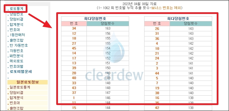 1회에서 지금까지 당첨 번호에 가장 많이 출현한 숫자는 무엇일까요? [로또 통계] 메뉴를 클릭해 보면 바로 확인이 가능합니다. 34번이 가장 많이 당첨 번호에 등장했는데요. 현재까지 163회나 나타났다고 합니다. 그 다음으로는 12번, 18번, 27번, 45번 순으로 많이 나왔어요.