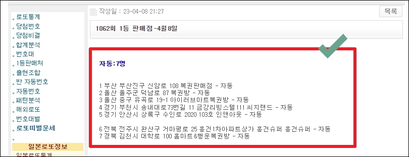 당첨 지역에 대한 상세 정보를 확인하고 싶은 회차의 게시물을 선택해 보세요. 그럼 판매점에 대한 상호명, 상세 주소, 자동 또는 수동 여부 확인을 할 수 있습니다.