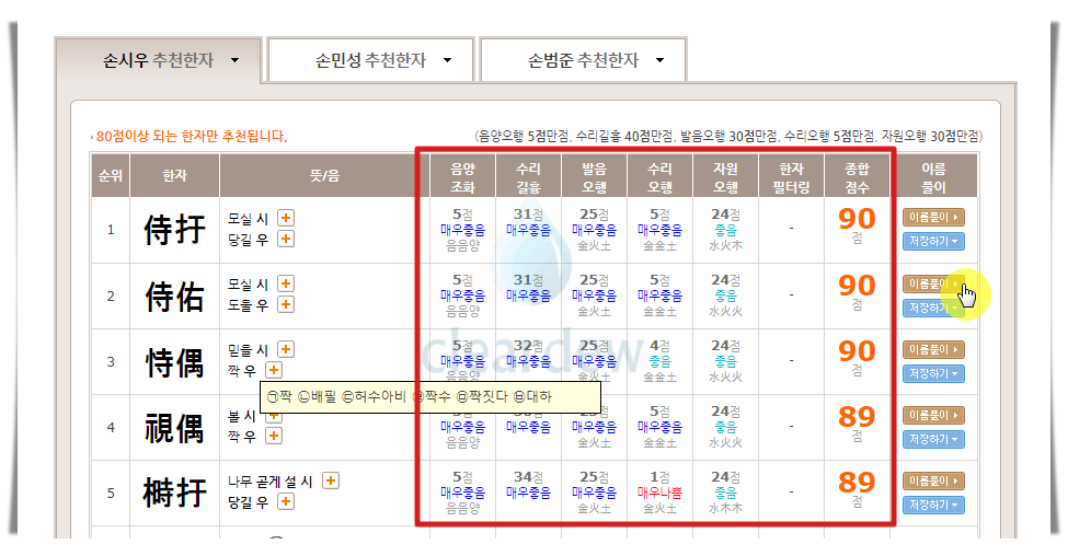 ▼ 저는 "손시우", "손민성", "손범준" 이렇게 3가지 성명을 선택했습니다. 이에 따라 각 성명에 맞는 5개의 한자를 추천 받을 수 있었는데요. 성명학에서 중요하게 여기는 음양조화, 발음오행, 수리오행, 자원오행, 수리길흉 부분에 있어서 높은 점수를 받고 있는 한자를 받아볼 수 있었습니다. 이 모든 것을 합하여 종합점수를 메기는데요. 80점 이상이 되는 것만 추천을 해준다고 합니다. 한자의 뜻도 한 번 살펴보고, 마음에 드는 한자를 선택해 주세요.
