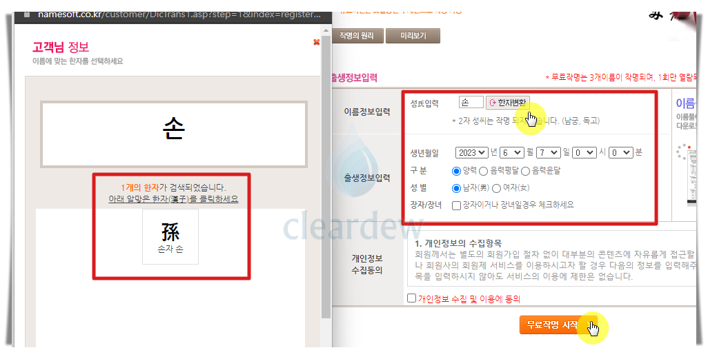 ▼ 작명 서비스를 이용하기 위해서는 아기의 성씨와 출생정보를 정확하게 입력해 주어야 하는데요. 참고로 성 씨의 경우에는 한자까지 입력해야 합니다. 한자로 변환을 하지 않으면 다음 단계로 넘어갈 수 없으니 참고하시길 바랍니다. 그리고 장자 및 장녀 여부로 중요하오니 이 부분도 해당 사항이 있을 때 꼭 체크하시길 바랍니다.