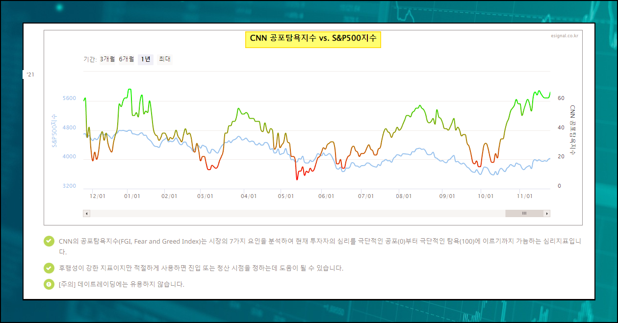 전 세계 증시에 흐름을 알고 싶을 때는 CNN 공포탐욕지수와 s&p500와 함께 나타낸 그래프를 이용해 보세요. 주식투자를 함에 있어서 야간선물지수보다 이 부분이 거시적으로 더 중요할 수 있습니다.