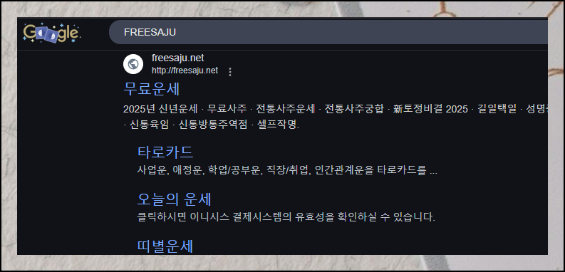 신비로운 운세의 세계로 초대합니다. 타로점과 함께 여러 점괘를 비교해보면 더욱 명확한 답을 얻을 수 있어요. 미래를 밝혀주는 다채로운 점술을 무료로 체험해보세요. 일단 첫 번째로 알려드릴 곳은 freesaju 사이트인데요. 무료로 볼 수 있는 운세 서비스가 많이 있습니다.