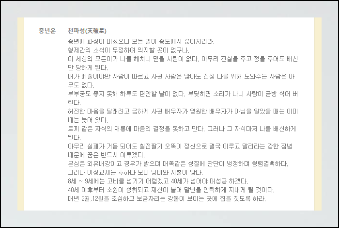 중년운의 천파성, 말년운의 천예성을 통해 길흉을 감지할 수 있습니다. 타고난 성향과 앞으로 일어날 일들에 대한 내용도 당사주 무료보기 서비스로 알아볼 수 있어요. 중요한 결정에 도움이 될 수 있는 정보들입니다.
