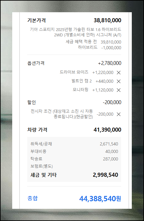 마우스 클릭 몇 번으로 원하는 모델과 옵션을 선택하면 자동으로 최종 구매 금액까지 계산해주니 대리점 방문 전에 미리 예산을 짜볼 수 있습니다.