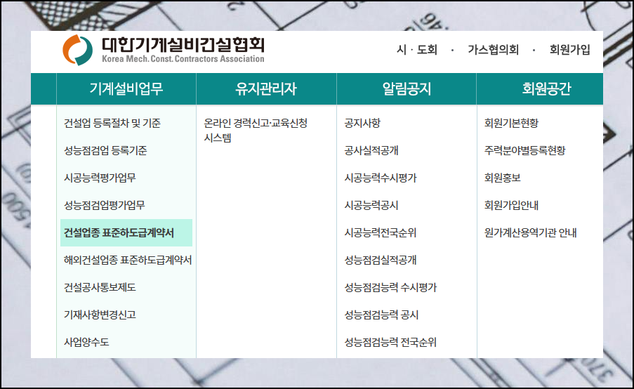 웹사이트 상단의 "기계설비업무" 메뉴를 선택해 보세요. 그럼 5번째 부근의 하위메뉴를 보면 "건설업종"과 "해외건설업종 표준하도급계약서"를 찾을 수 있습니다.
