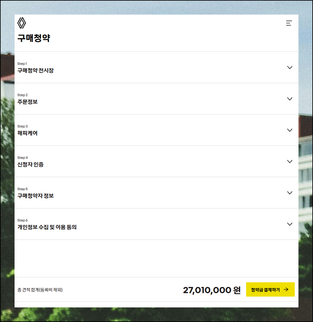 마지막 단계에서 보면 "구매 청약작성" 버튼을 만나볼 수 있는데요. 해당 버튼을 누른 후, 몇 가지 정보를 입력하면 자동차 구입 단계로 진행이 가능합니다.