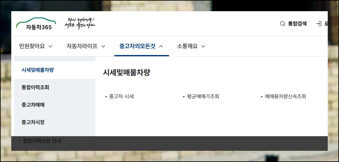 홈페이지에 접속하면 여러 개의 주요 메뉴가 화면에 나타납니다. 차량번호를 이용한 정보 검색을 시작하려면 화면 중앙에 위치한 '통합이력조회' 메뉴를 클릭하세요.