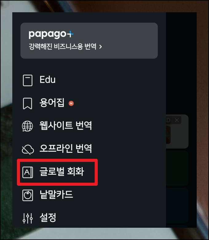파파고를 실행하면 사용자 인터페이스가 깔끔하게 정리되어 있을 거예요. 화면 왼쪽 상단에 있는 메뉴 아이콘을 터치해보시면 됩니다. 여러 옵션들 중에서 다섯 번째 위치에 글로벌 회화라는 메뉴가 보일 텐데요. 바로 이 기능이 제가 추천하려던 여행 영어회화 어풀 서비스입니다.