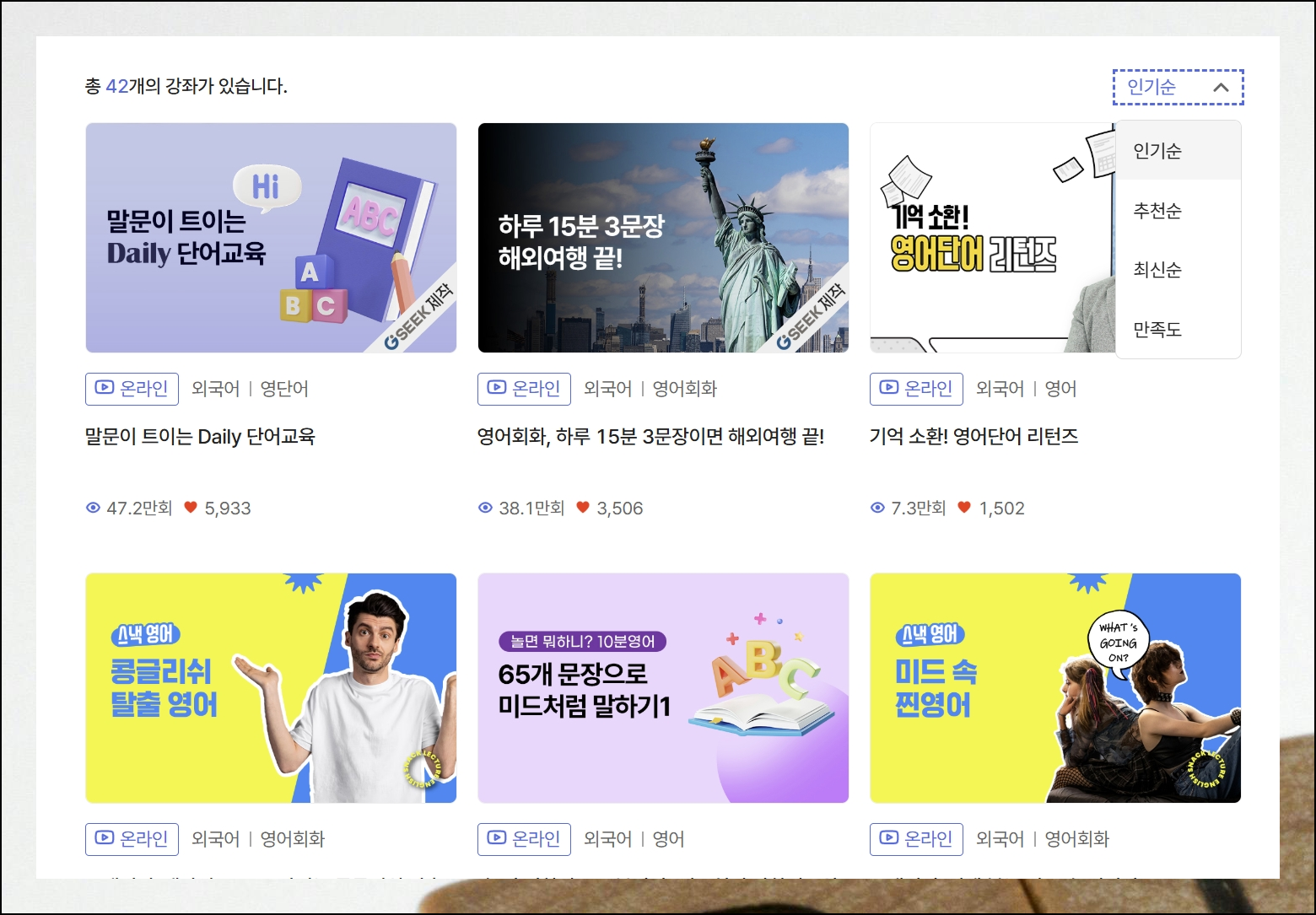 영어회화 공부 혼자하기에 알맞은 강의를 찾기 좋은방법을 알려드릴게요. 바로 정렬 기능을 사용하는 것인데요. 페이지 우상단의 정렬 기능에서 인기강좌를 선택하면 많은 수강생들이 선택한 우수한 강좌부터 볼 수 있습니다. 인기가 높다는 것은 그만큼 많은 사람들이 이용한다는 것이고, 그만큼 퀄리티가 보증될 가능성이 높다는 의미일 수 있죠.