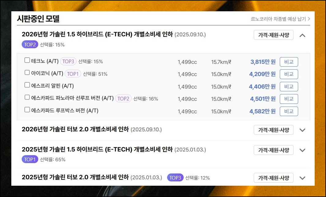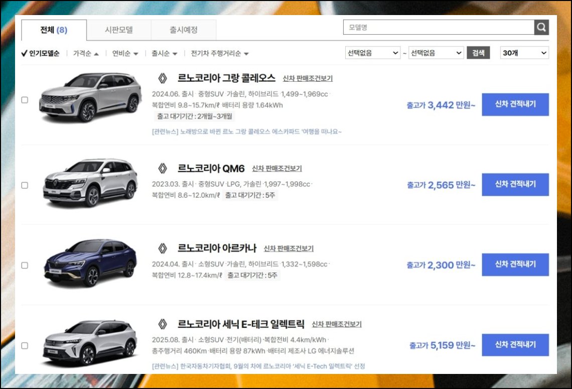 다나와 같은 비교 플랫폼을 활용하면 트림별 출고가부터 취득세, 공채 매입비까지 한 화면에서 파악할 수 있어요. 르노삼성자동차 라인업 중 관심 모델을 골라 원하는 조건으로 견적을 직접 구성해볼 수도 있습니다. 이렇게 미리 신차가격표를 확인해두면 대리점에서 상담받을 때 훨씬 여유 있게 비교하고 판단할 수 있어요.