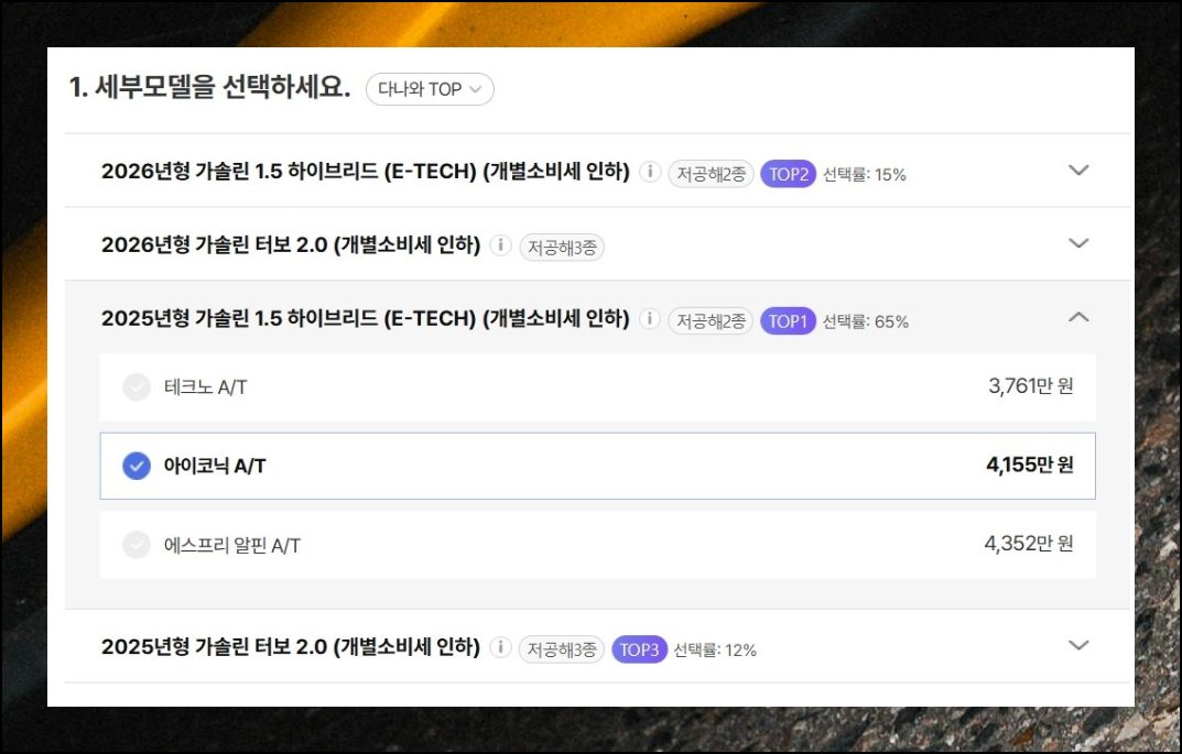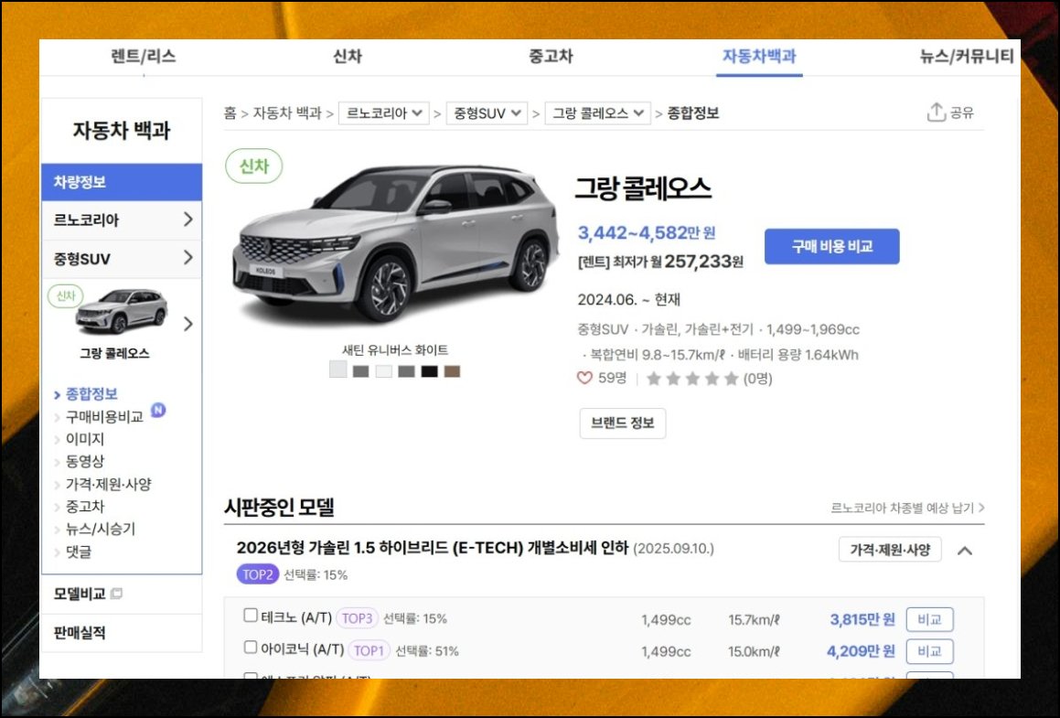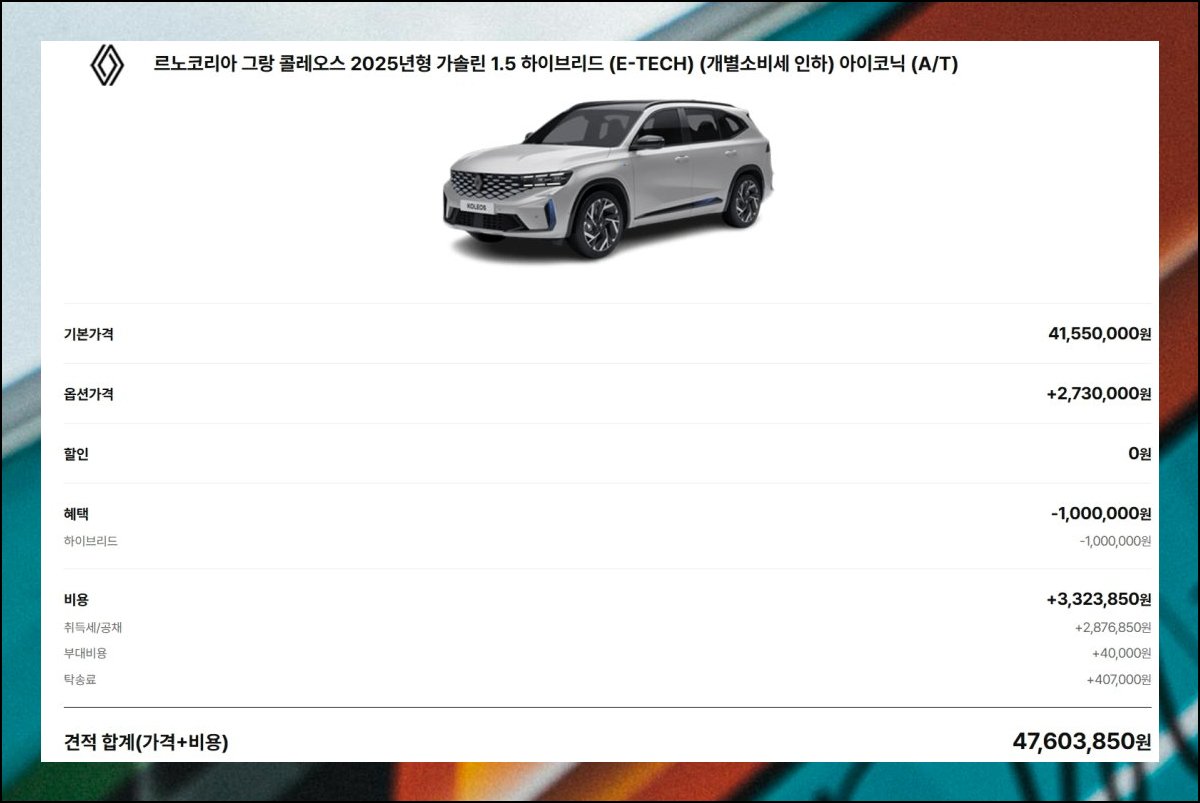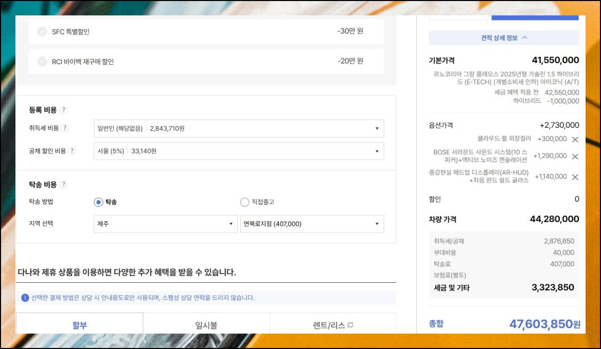 올해 나온 르노삼성자동차 그랑 콜레오스 1.5 가솔린 하이브리드 모델로 직접 테스트해봤어요. 온라인에서 곧바로 지불 총액을 알아낼 수 있습니다. 등록 세금이나 채권 매입 금액 같은 세부 내역이 전부 공개되어 있어요. 딜러 방문 후 실제로 결제하는 액수와 별 차이가 없는 수준입니다.