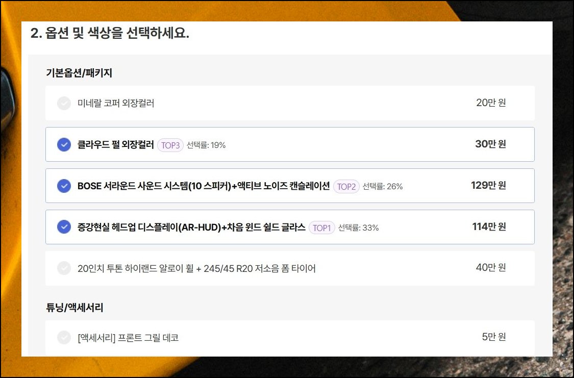 등급 결정을 마쳤으면 부가 장비 선택 단계입니다. 르노삼성자동차 신차가격표 산출을 위해 필요한 품목에 표시해주세요. 뭘 넣을지 고민이라면 다수 고객이 담는 인기 품목 중심으로 살펴보세요. 개별 장비 내용은 가격 옆 펼침 표시를 탭하면 나옵니다.