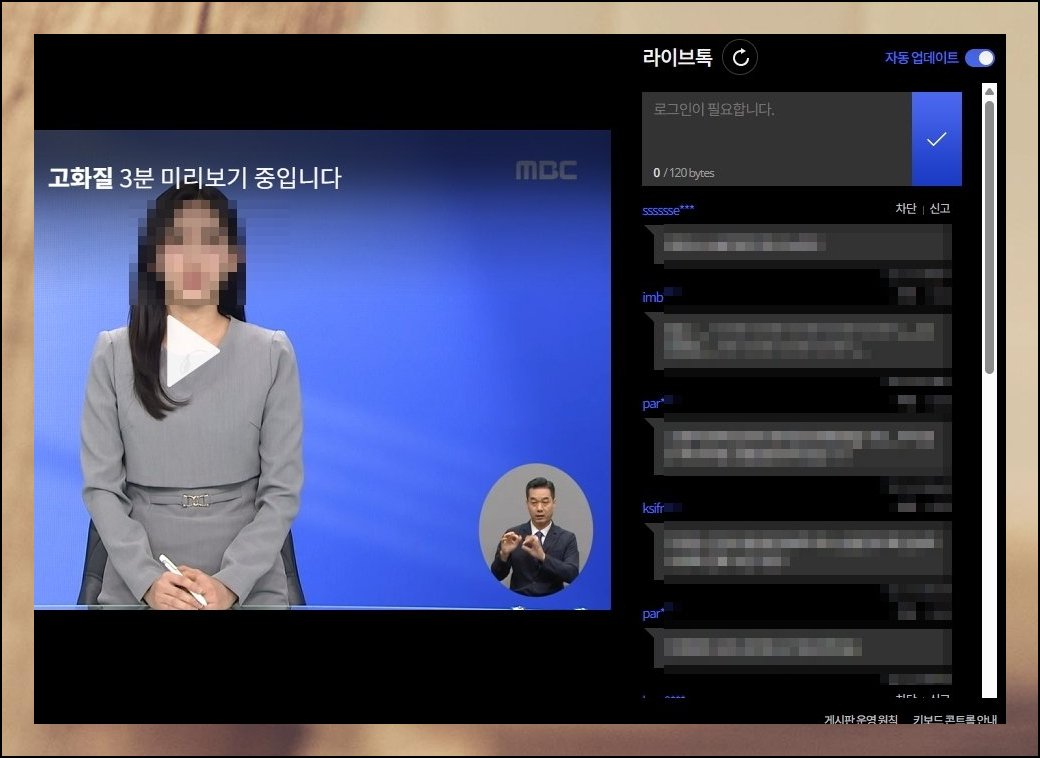 MBC 실시간 뉴스를 틀어놓고 동시에 다른 사람들과 의견을 주고받을 수 있는 독자적인 장치가 마련되어 있습니다. 오직 웹 환경에서만 접근 가능한 고유 기능이에요. 영상 창 우측 하단 라이브톡 아이콘을 탭하면 소통의 장이 열립니다. 혼자 보기보다 여러 사람과 생각을 나누는 흥미로운 체험이 될 거예요.