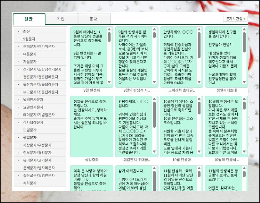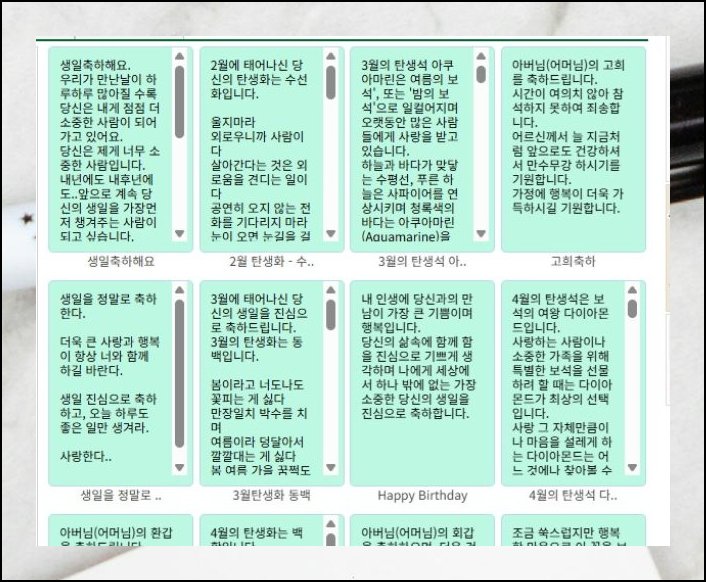페이지 좌측을 살펴보면 장면과 목적에 따라 깔끔하게 나뉜 탭이 보입니다. 생일축하 항목을 열면 정성껏 모아 둔 메세지들을 바로 확인 가능해요. 옆에 딸려 나오는 소소한 그림 요소도 같이 활용해 보세요. 텍스트에 조그만 시각 장식 하나만 붙여도 분위기가 한결 환하고 부드럽게 달라집니다.
