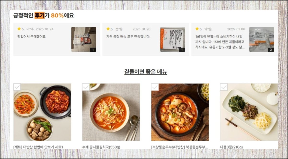 반찬 품목 폭이 넓은 덕분에 실사용 소감도 넘쳐나요. 꾸밈없는 체험기는 올바른 판단을 내리는 데 확실한 길잡이가 됩니다. 한 번도 접해 보지 못한 음식이라도 후기를 훑어두면 망설임이 사라져요. 종류50가지 중 어떤 걸 골라도 시행착오를 줄여 주는 가장 빠른 길입니다.