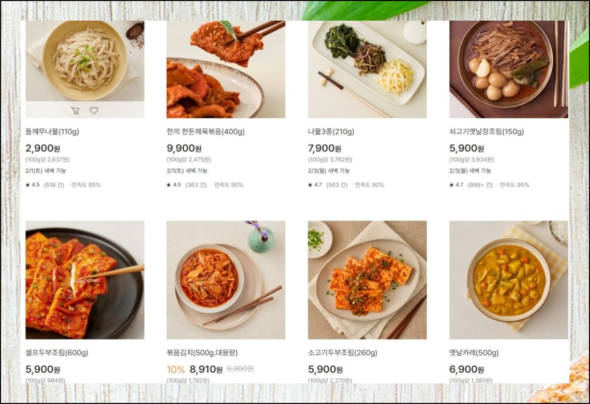 직접 불 앞에 서는 수고를 덜어주는 시대가 열렸어요. 완성된 반찬을 취향껏 골라 담는 방식이 어느새 익숙한 일상이 되었습니다. 종류50가지가 넘는 품목 중 끌리는 것만 장바구니에 넣으면 그만이에요. 시간에 쫓기는 회사원이나 혼자 사는 학생에게 이보다 나은 대안은 찾기 어렵습니다. 모바일 식품 쇼핑이 동네 마트를 대신하면서 반찬 고르는 재미도 커졌어요.