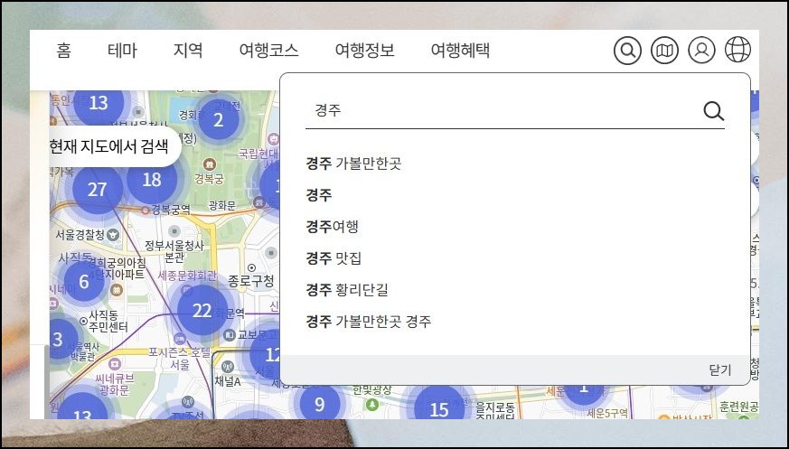 관광지도를 끌어서 경주 위치로 옮겨 주세요. 화면에 보이는 돋보기 모양 그림을 누르면 검색 기능이 활성화됩니다. 새 페이지가 펼쳐지면 오른편 위쪽 재설정 버튼을 눌러 보시기 바랍니다. 그러면 검색된 명소가 몇 곳인지 숫자로 알려줘요. 그 숫자를 살짝 터치하면 가까이 당겨져 또렷하게 살펴볼 수 있어요. 원하는 영역까지 자유롭게 둘러보시면 됩니다.